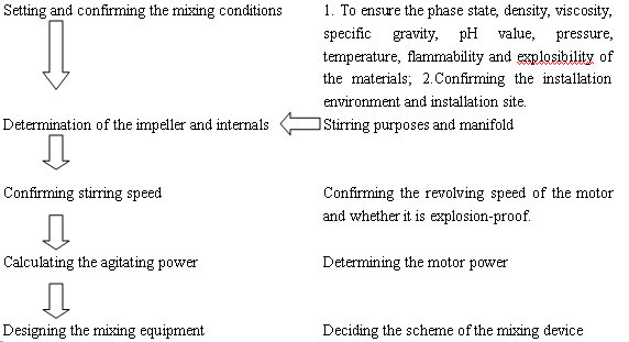 2. Confirming the motor power, stirring speed and agitator diameter in accordance with determined impeller type, the flow state and the requirements of stirring time, settling velocity and dispersion degree control through experimental means and computer simulation design.